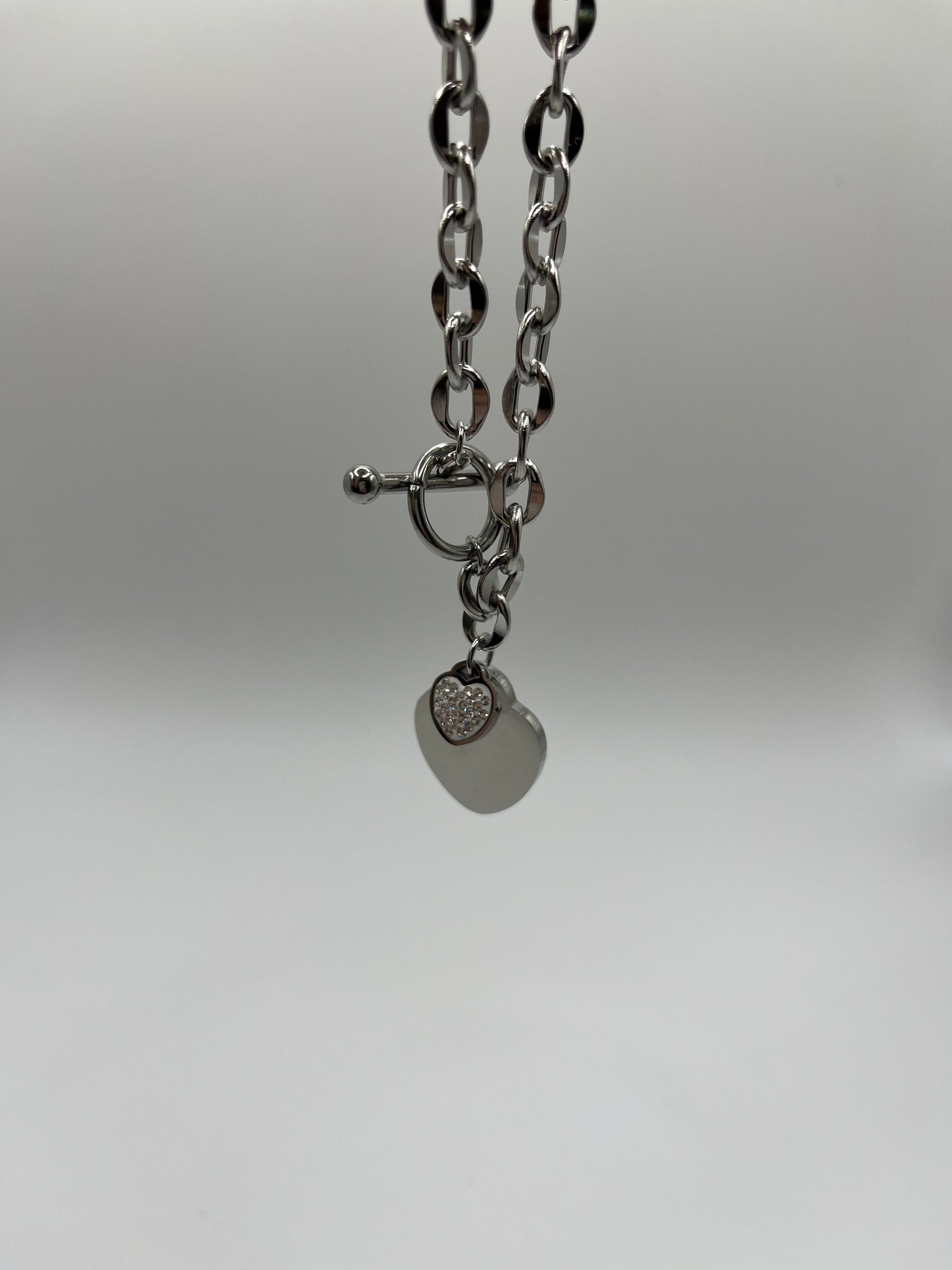 Esta pulseira dourada é a escolha perfeita para quem procura elegância e estilo num só acessório. O seu design moderno combina uma corrente robusta com fecho toggle fácil de usar, enquanto o pendente em forma de coração cravejado com zircónias brilhantes acrescenta um toque de sofisticação e romantismo.